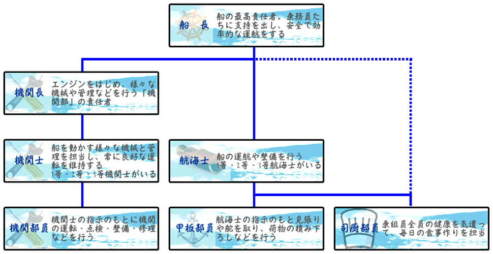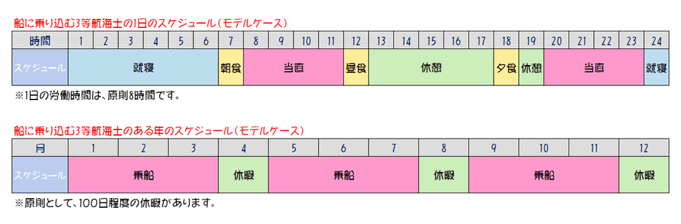 1日を0~4時(ゼロヨン)、4~8時(ヨンパー)、8~12時(パーゼロ)、12~16時(ゼロヨン)、16~20時(ヨンパー)、20~24時(パーゼロ)と3交代でメンバーが交代し船は運航されます。入港、出港時は入港スタンバイ、出港スタンバイと言い、見張り・綱取り・機器の運転に沢山の人手が必要なため乗組員全員で行います。荷役は積荷によって乗組員全員で行う場合と交代制で行う場合があります。